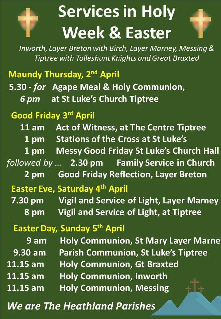 The Heathland Parishes (in vacancy): Tiptree with Tolleshunt Knights & Gt. Braxted, Messing, Inworth, Layer Marney & Layer Breton